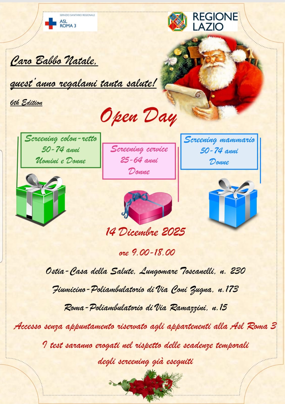 Domenica 14 dicembre 2025, dalle 9:00 alle 18:00, torna l'evento "Caro Babbo Natale, quest'anno regalami tanta salute!", giunto alla sua sesta edizione. Un'iniziativa promossa da ASL Roma 3 e Regione Lazio, dedicata alla prevenzione oncologica gratuita per i cittadini residenti nel territorio.