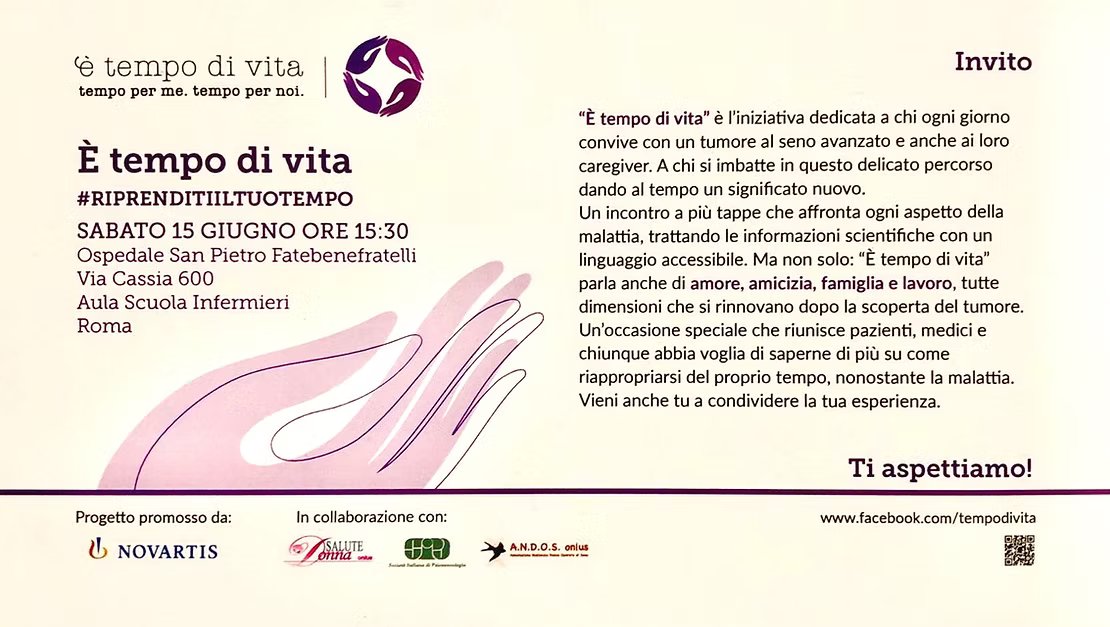 "E' tempo di vita" è l'iniziativa dedicata a chi ogni giorno convive con un tumore al seno avanzato e anche ai loro caregiver. A chi si imbatte in questo delicato percorso dando al tempo un significato nuovo.