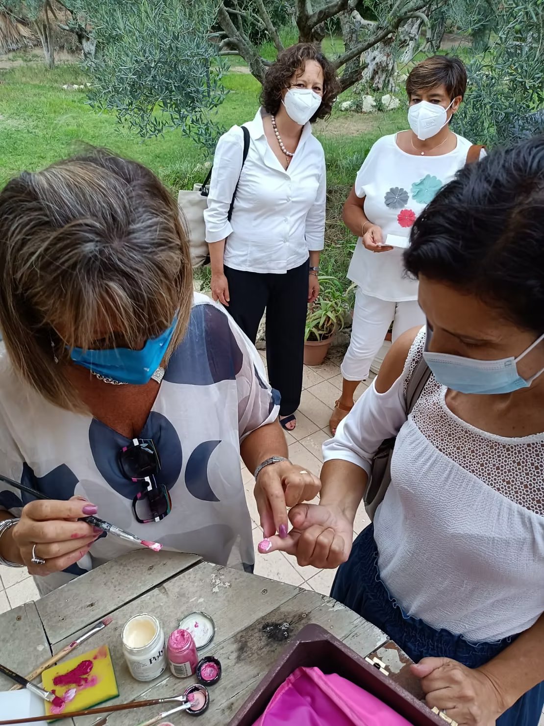 Ostia, Parco dello Stagno, 16 settembre 2021. Nadia pittrice e autrice del quadro mentre prepara, con colori adeguati, il dito-pennello delle nostre socie che in un unico gesto performativo imprimeranno sulla tela, indelebilmente, la loro impronta!